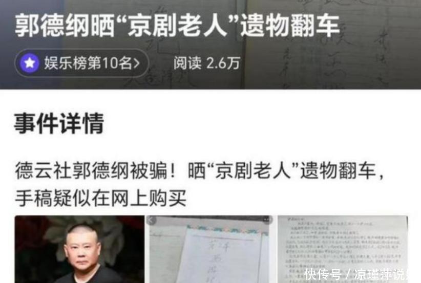 2023年4月发生了相声圈“京剧老人托孤”事件,先是郭德纲发文晒图说有一位老人托人将京剧剧本和印章以及亲笔信交给他,然后郭德纲粉丝和自媒体展开疯狂宣传将此事推上热搜。